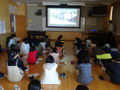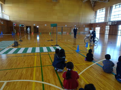 交通安全教室では、警察官の方の話を聞いたり、安全な横断歩道の渡り方や、安全な自転車の乗り方を練習したりしました。高学年は危険な場所や状況を動画で見るなど、学年に応じた安全指導を行いました。
