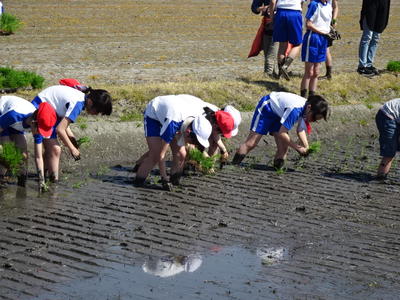13日(木)、良い天気に恵まれて、5年生で田植えをしてきました!田んぼの泥の感触に驚きながらも、慣れてくると楽しくなって、たくさんの笑顔が見られました。おいしいお米に育ってほしいと思いを込めて苗を植えました。秋の稲刈りが楽しみです!