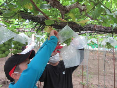 2日目は、農業体験をしました。ブドウに傘をかけたり、枝豆やトマトを収穫したりしました。すぐにコツをつかんだ子どもたちは、楽しみながらも、もくもくと作業をしていました。