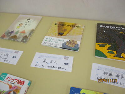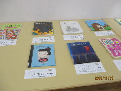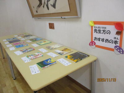 図書室前には、先生方おすすめの本が展示されています。子どもたちも興味深く見ていました。