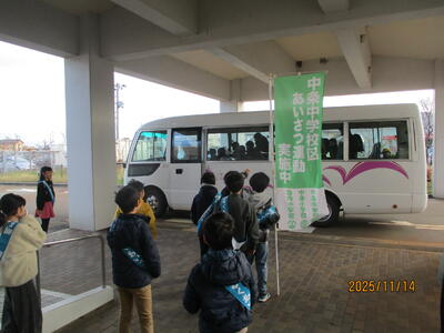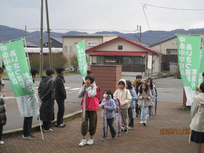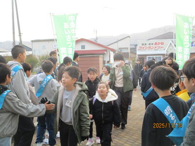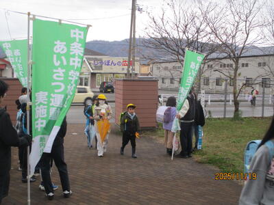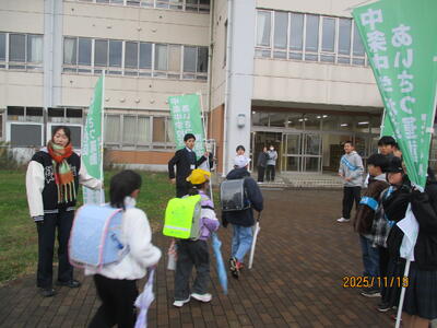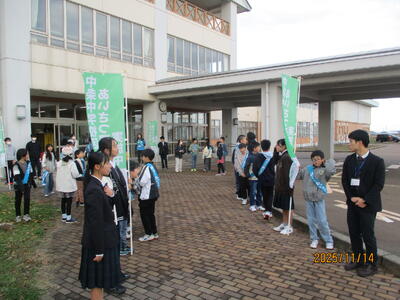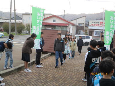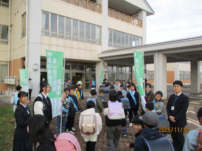 中条中学校生徒会の皆さんが来校してくれて、小学生と一緒にあいさつ運動をしてくれました。