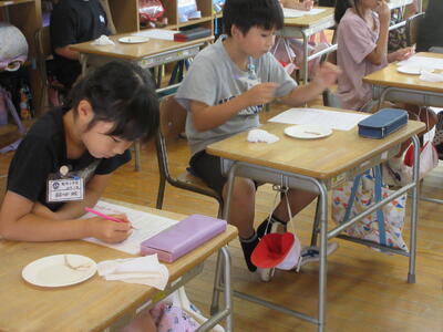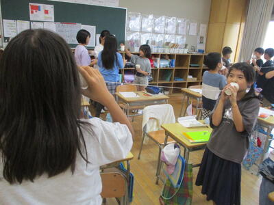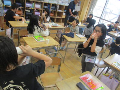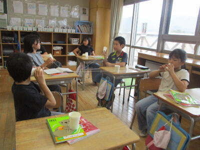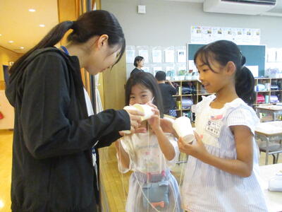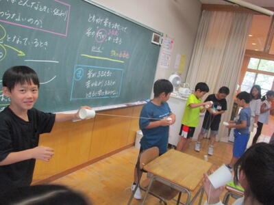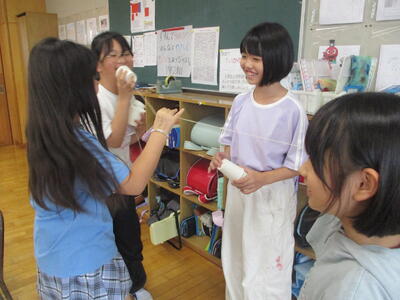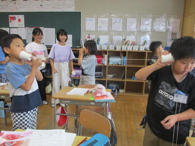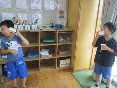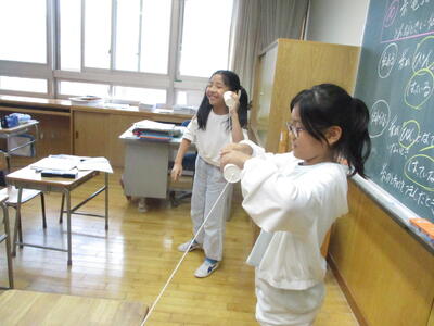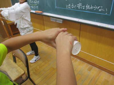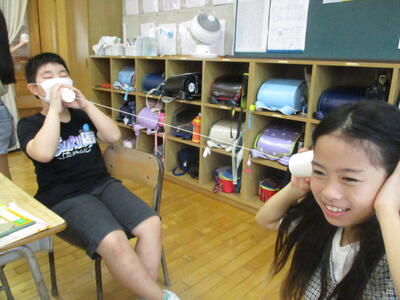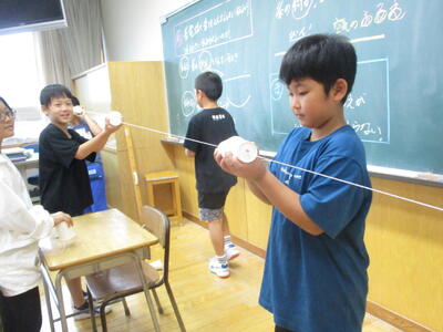 音について学習する単元です。単元終末段階で、糸電話を作って、音の「ふるえ」について実感を伴った学習をしました。真剣に、そして、楽しく学習していました。