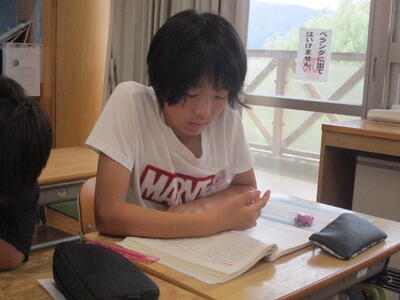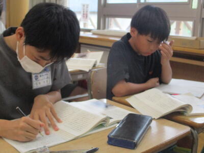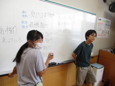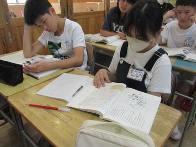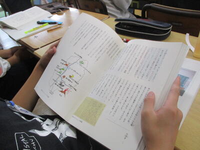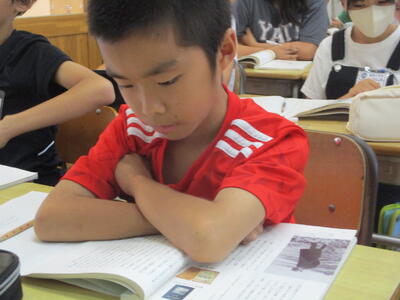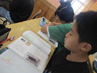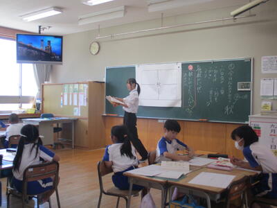 宮沢賢治の名作を読んでいます。難解な作品世界を味わうために、宮沢賢治についての学習を進めていました。教科書に掲載されている「イーハトーブの夢」を読み深め、宮沢賢治の「思い」 「夢」 「願い」 「理想」を対話しました。教科書に書いてあることから書いていないことを読む、6年生らしい深い読みでした。