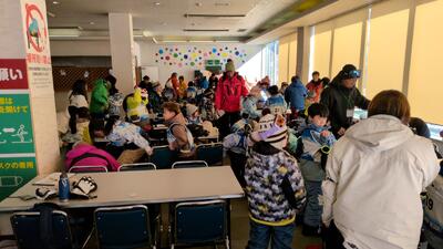 胎内スキー場は天気雪、風はやや強い状態です。4年生やる気いっぱいです。がんばりましょう!