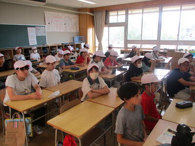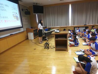 胎内市役所税務課職員の方を講師に、6年生租税教室を行いました。税金は約何種類あるか(約50種類)、小学生1人あたりで1か月にかかる税金は約いくらか(約7万円)、もしも税金がなかったら(大変なことに…)、など、小学生にもわかりやすく税のことを教えてくださいました。