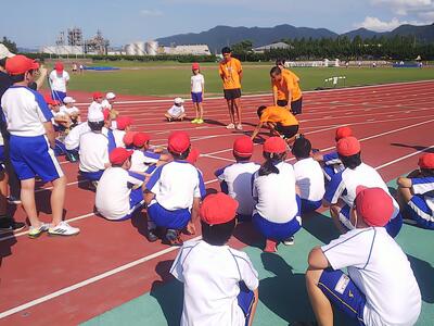 胎内小、中条小の6年生が、開志国際高校陸上部の皆さんから、陸上競技の練習方法を教えてもらい、すばらしい動きのお手本を見せてもらいました。