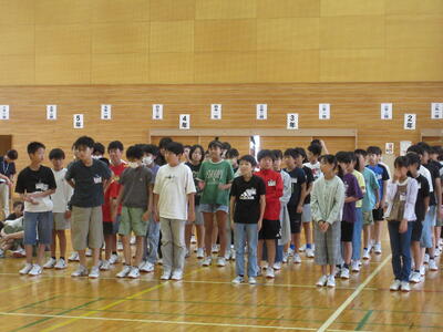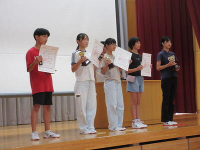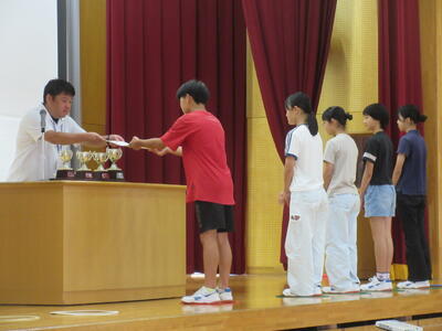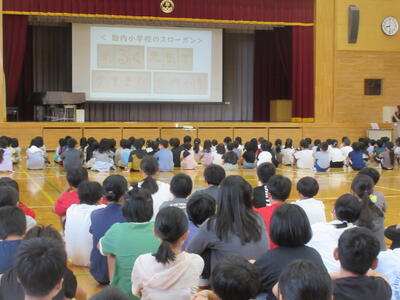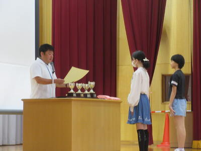 また、夏休み科学標本写真展覧会、胎内市親善陸上競技会の表彰を行いました。最後は、生活指導担当職員から、今月のめあてについての話がありました。