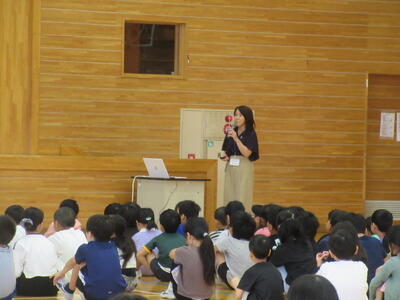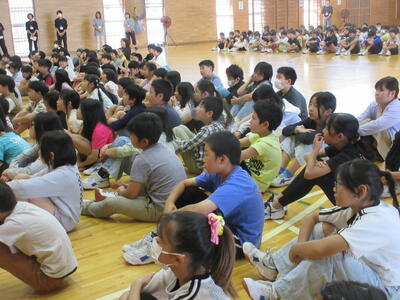 はじめに校長先生のお話でした。校長先生からは、①友だちへイライラぶつけないで相談すること、②校歌を一生懸命に歌おう、という内容でした。10月は、いじめ見逃しゼロスクール集会がありますし、友だちへのよりよい接し方、学級のめあての確認などを行います。また、校歌を大切にするという意味でも、校歌をしっかり歌えるようにみんなで歌っていきます。