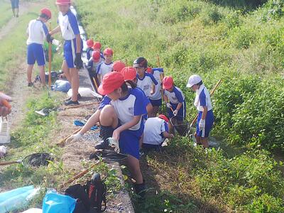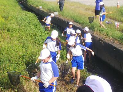 4年生は柴橋川で生き物探し。捕まえた魚、ヤゴなどを学校のビオトープに放すそうです。
