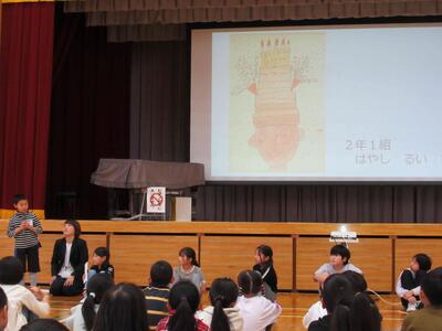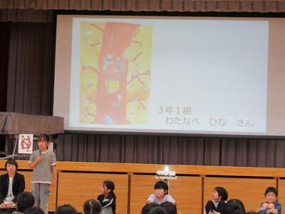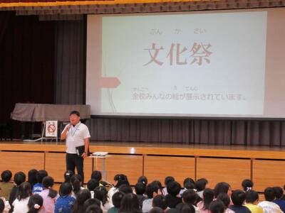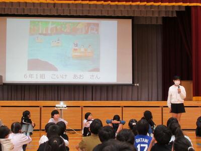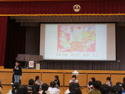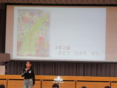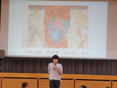 校長先生のお話、図工主任からの鑑賞指導、学級代表児童の見どころ紹介でした。