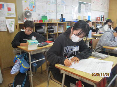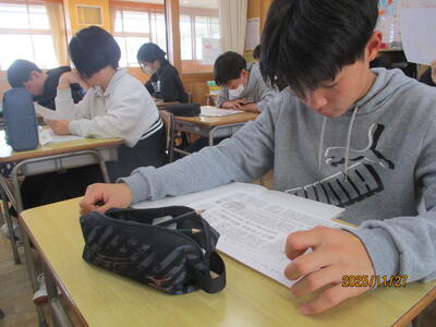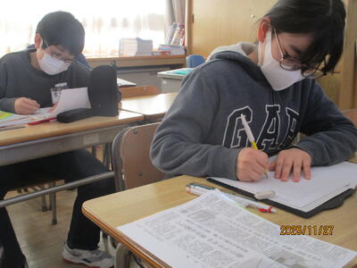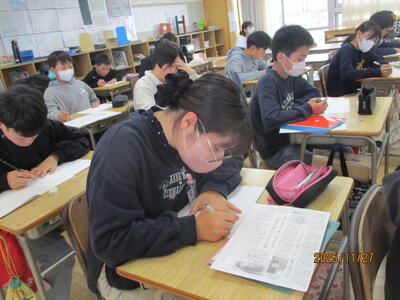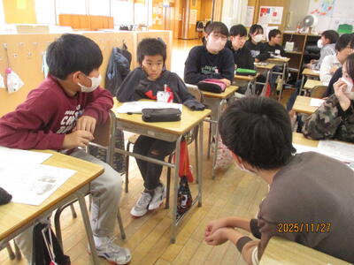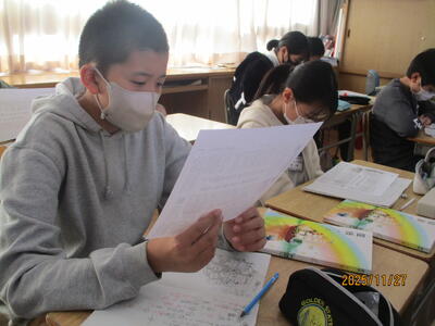 今日は、1組も2組も、「命のアサガオ」の新聞記事から、「命のつながり」について今の考えを書く活動からスタートしました。この「命のアサガオ」は、胎内小学校で大切にしている活動です。これから出合う立松和平の「海の命」を読む学習を経て、単元終末には再度「命のつながり」についての作文を書きます。国語の学習と、胎内小学校が大切にしていることとの関連学習です。