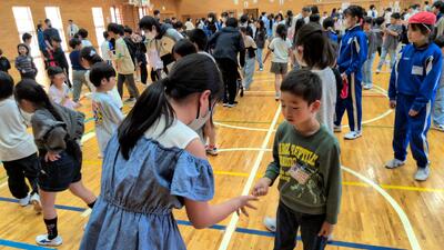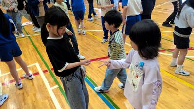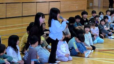 1年生を迎える会を行いました。1年生の自己紹介と進化ジャンケンが主な内容です。自己紹介では、6年生が上手にフォローしていました。