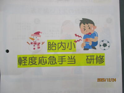 子どもたちがケガをしてしまった際に、教室等でできる手当て、すぐに手当てが必要な場合に大切にしたこと、そういった内容でした。子どもたちの安全な学校生活のための、大切な研修でした。