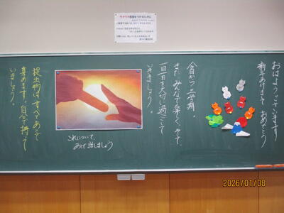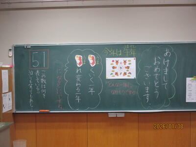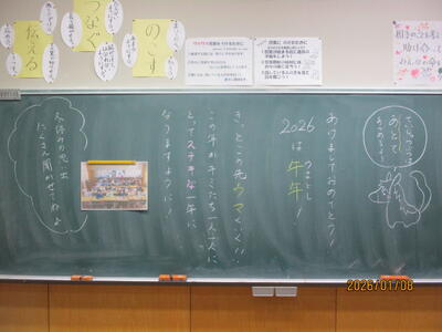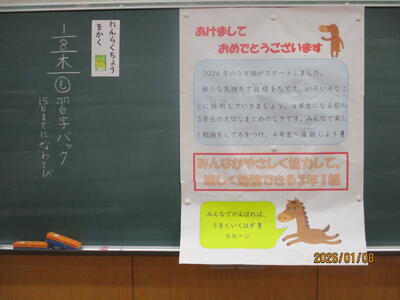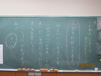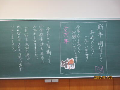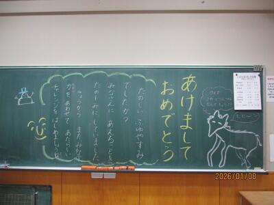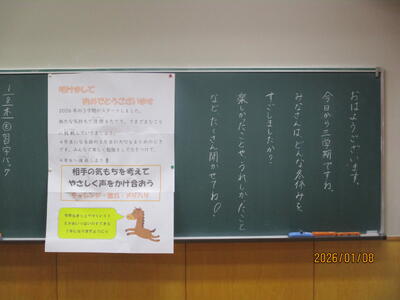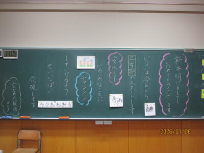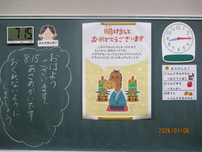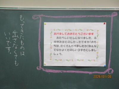 各教室では、子どもたちが冬休みにがんばった課題を回収したり、3学期の教材を配付したりしていました。また、すごろくやクイズ、語り等で冬休みを振り返っている学級もありました。